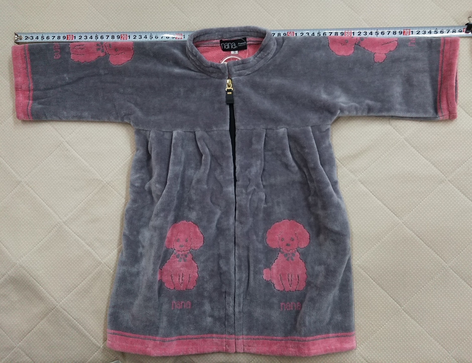子どもミニガウン:両前身頃、両袖、背面にかわいいプードルや猫の柄がり、少しゆったりと作られているので1歳~3歳ぐらいまでは、充分お使いいただけます。贈り物にもぜひご利用ください