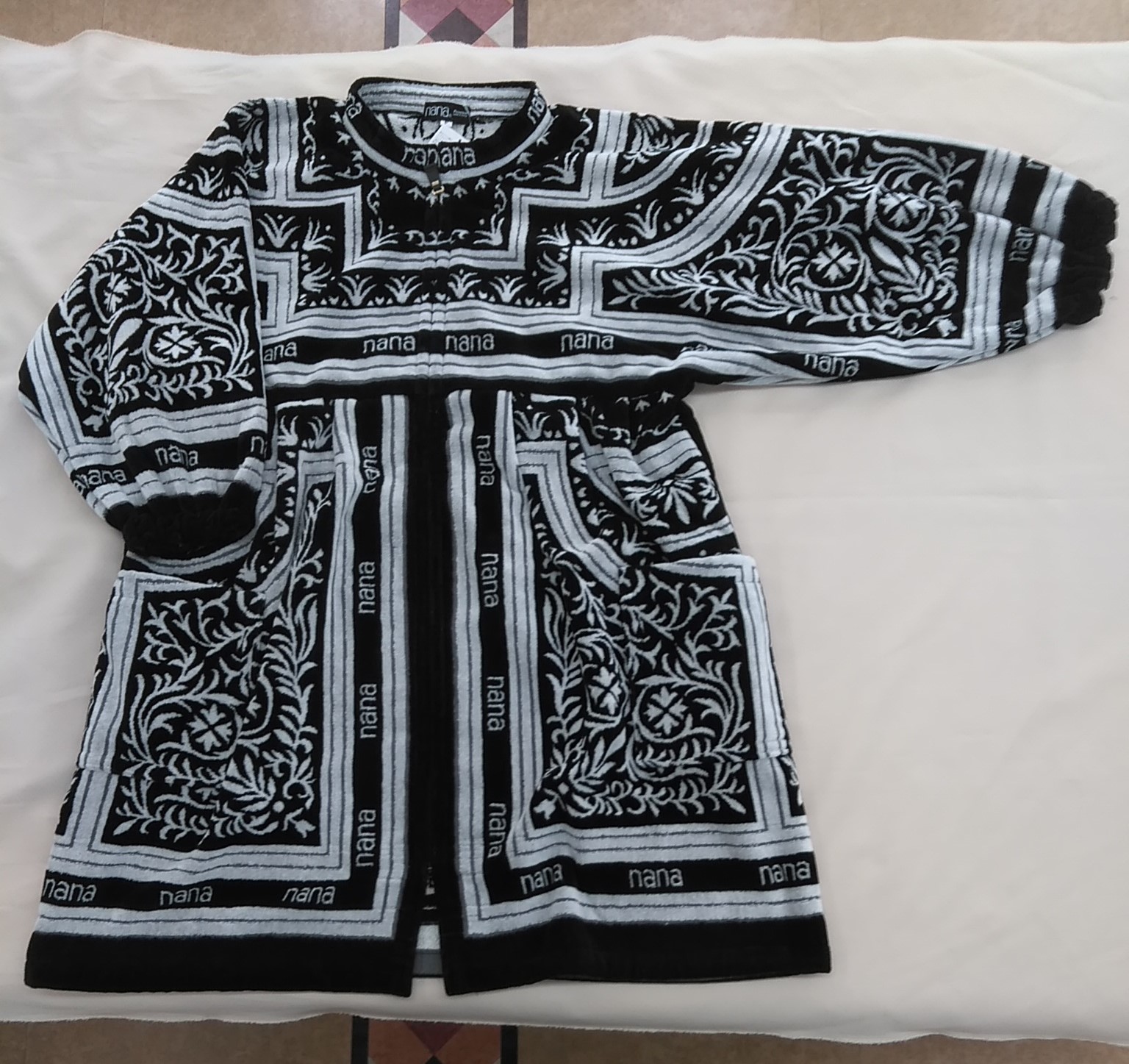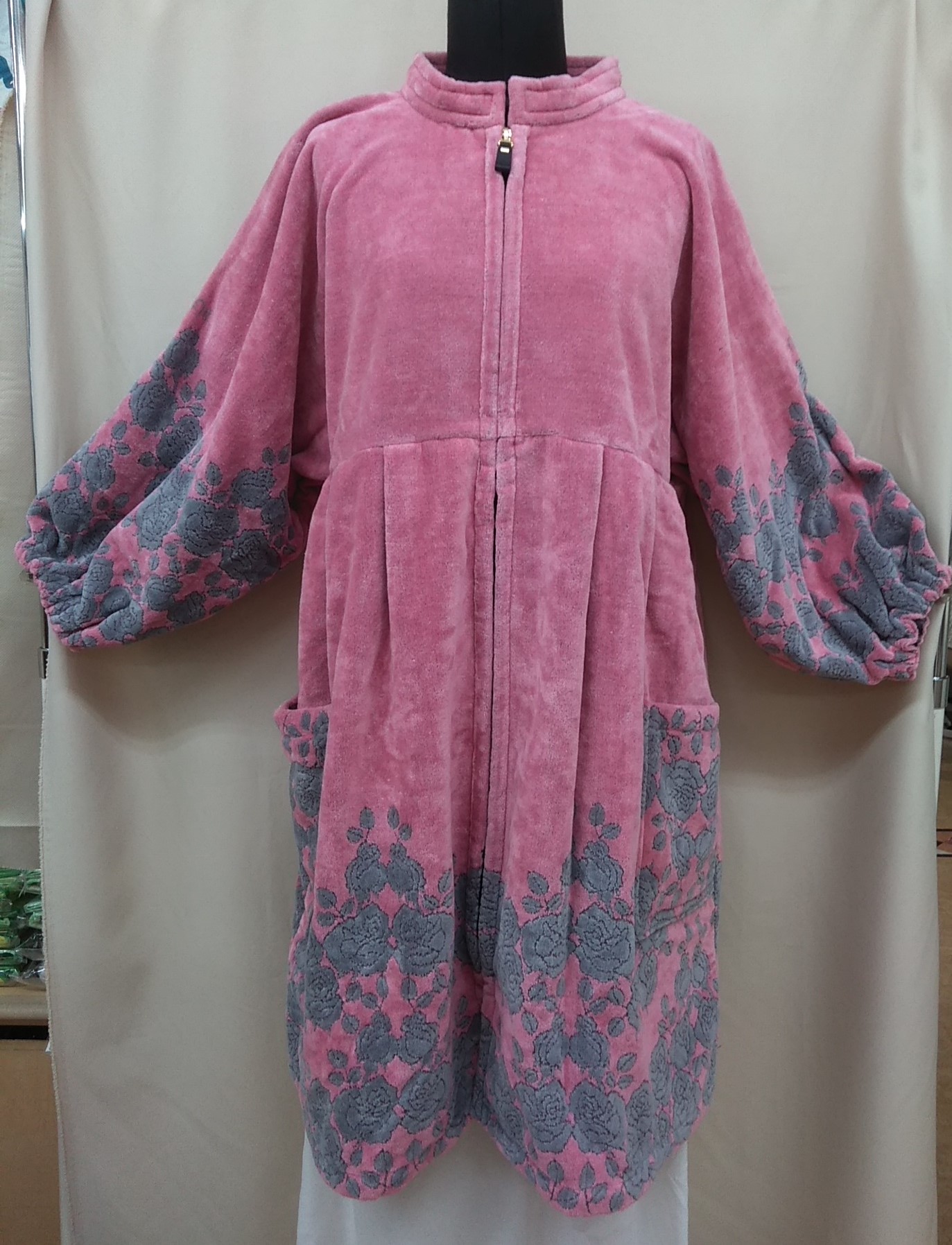 ショートガウン:袖はゆったりとしたシルエット、胸まわりは切り替えしになっているので、ゆったりと着ていただける商品です。前はファスナー、ポケットが左右に1つずつ。